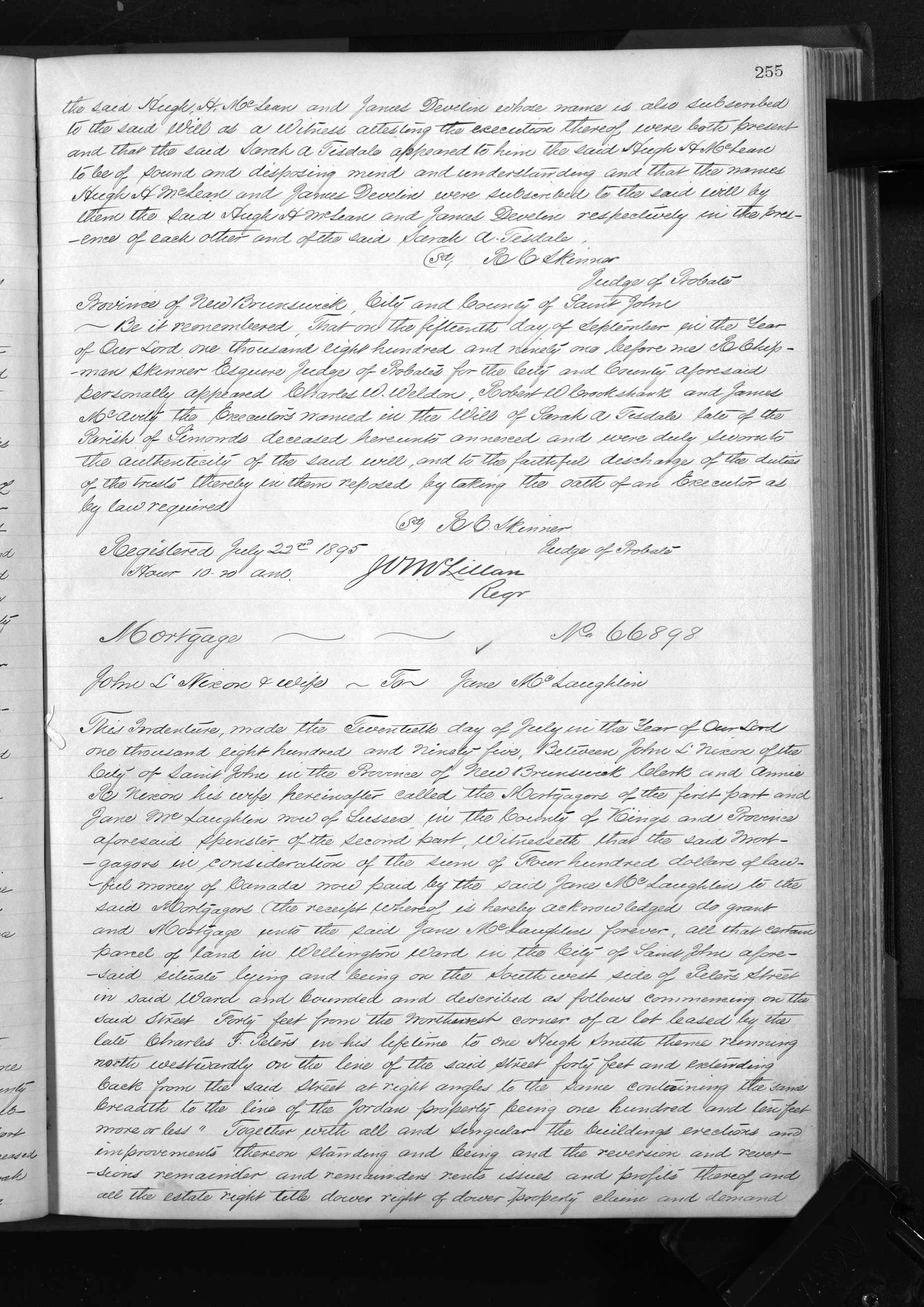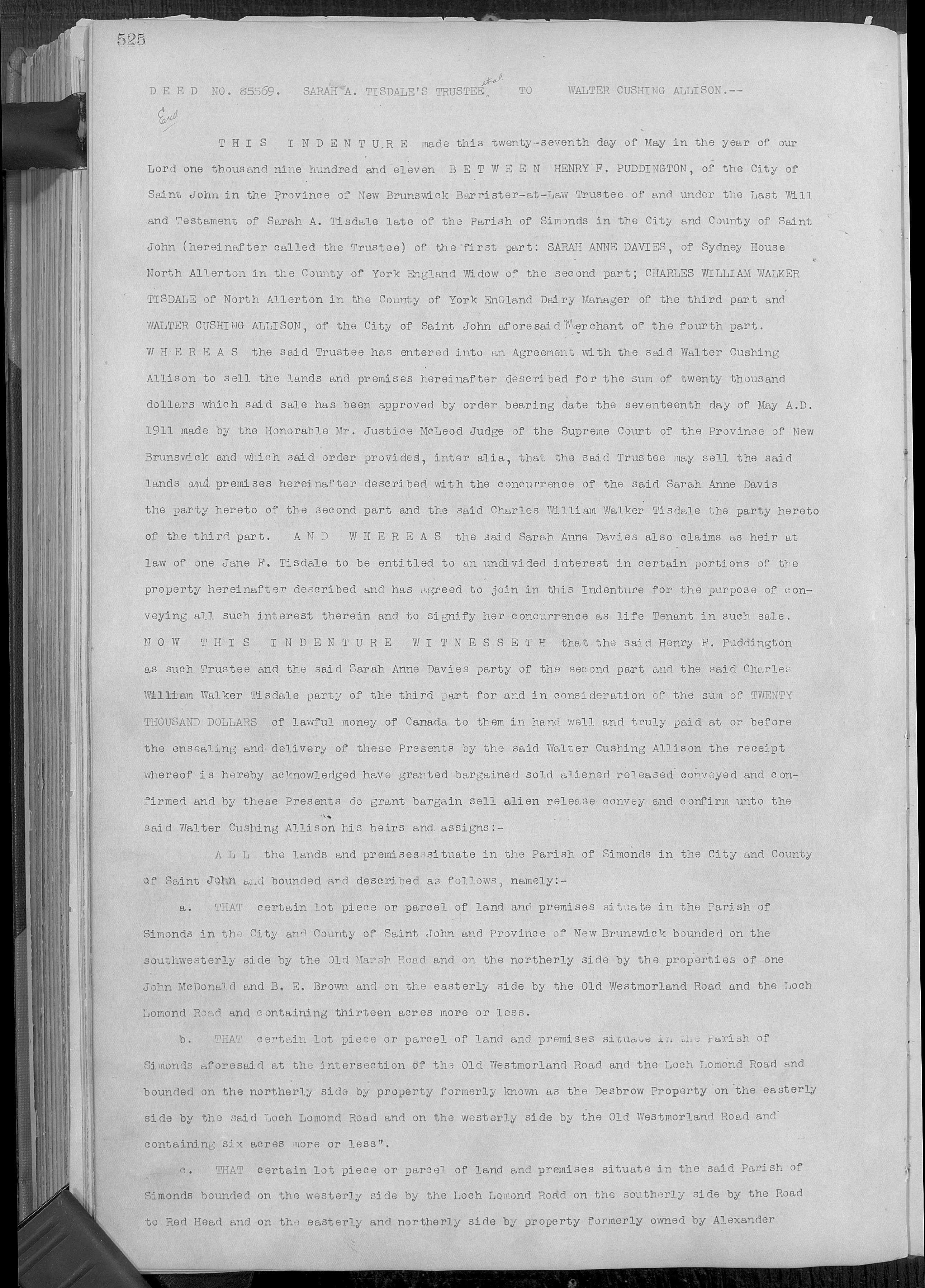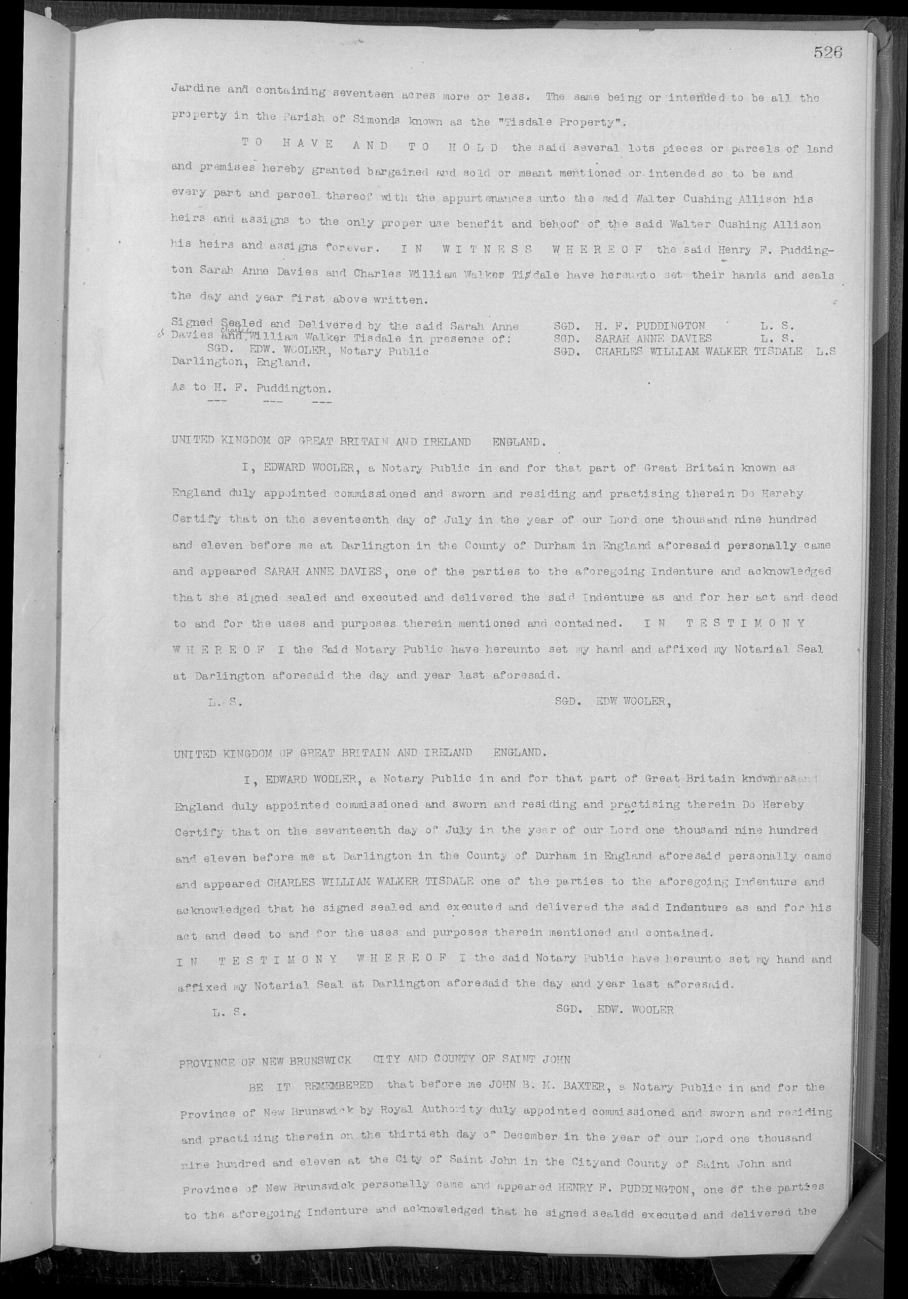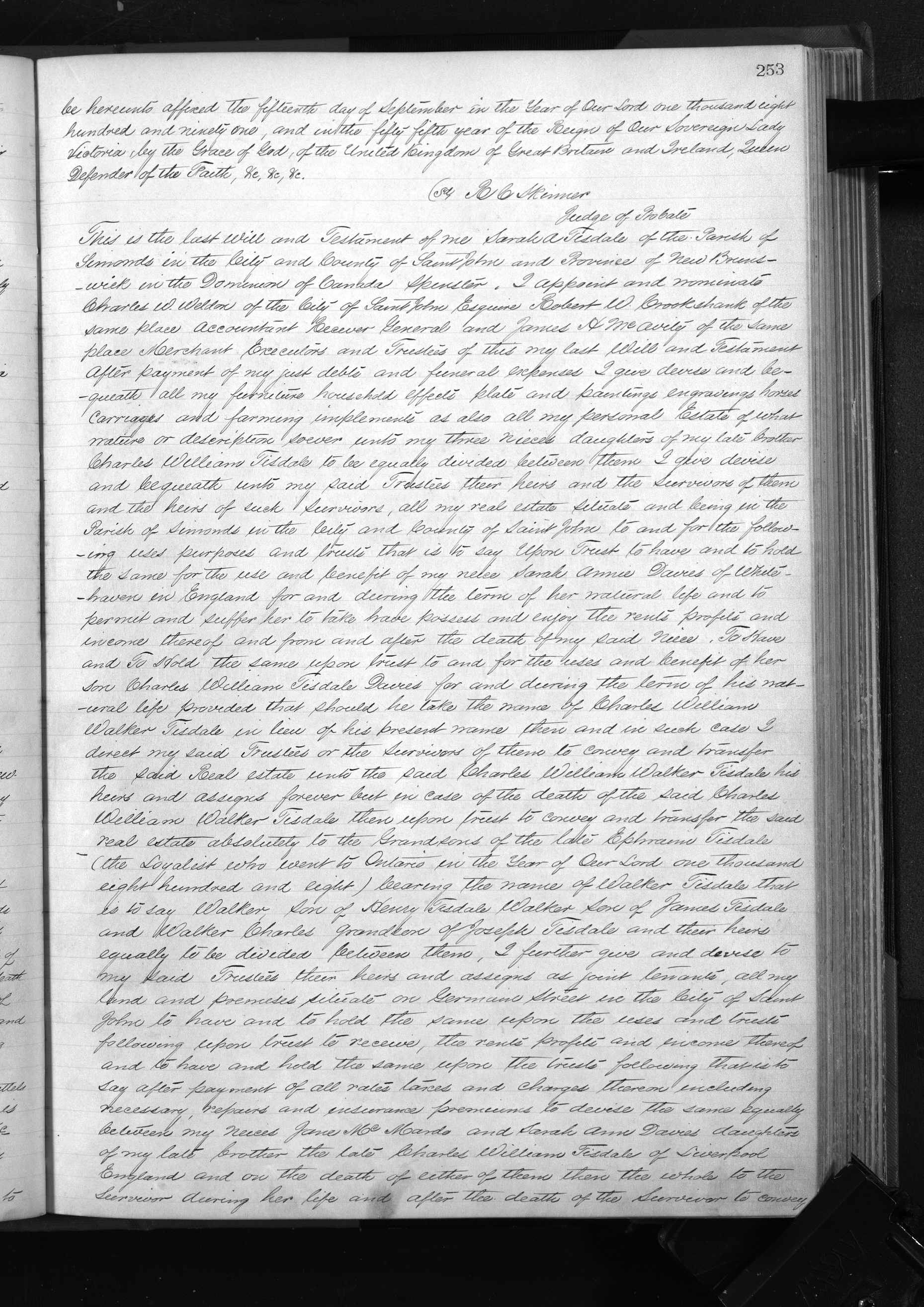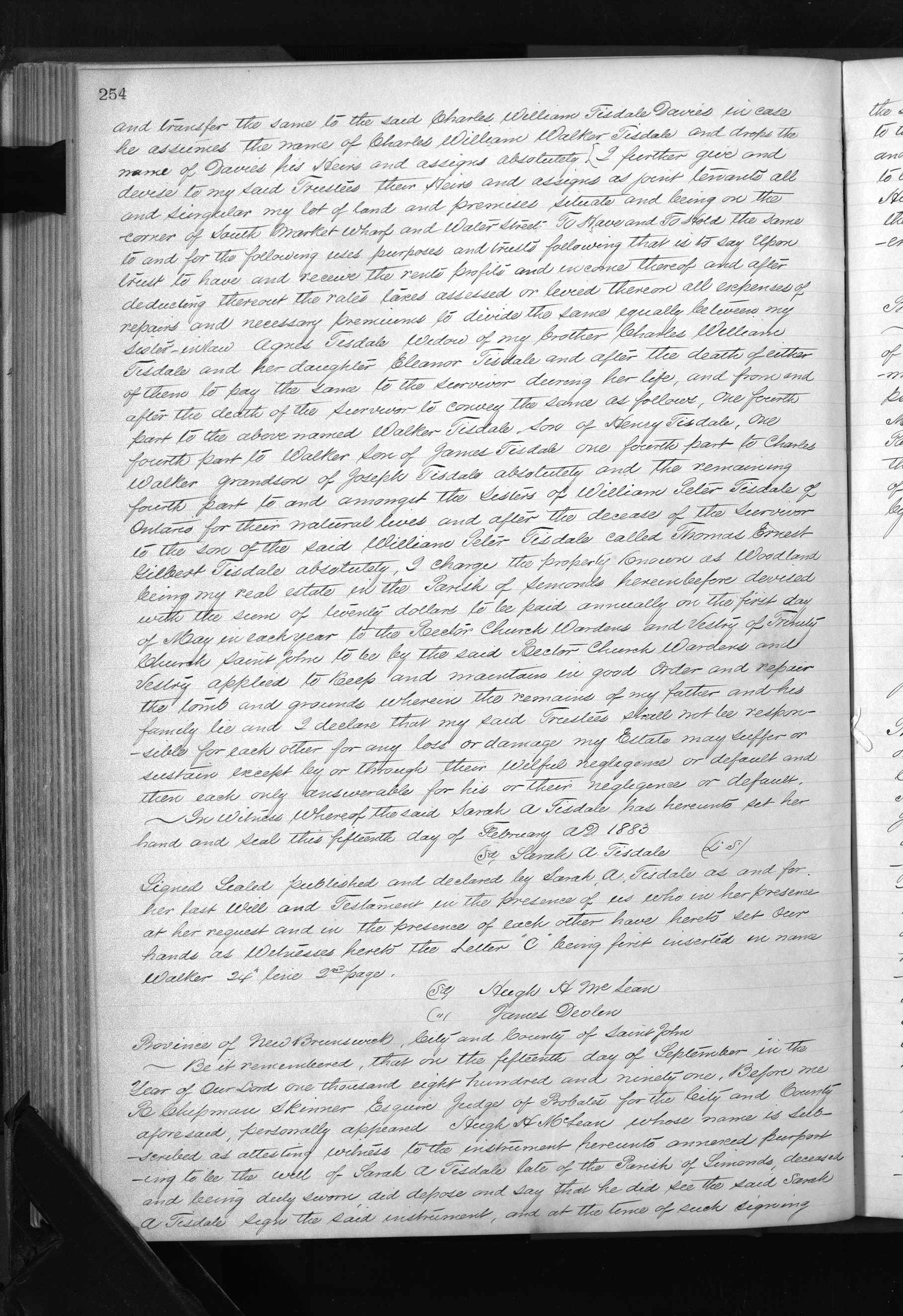 Ann’s will is fascinating. As described in the 1891 Saint John Globe: “Probate was granted Tuesday of the will of the late Miss Sarah A. Tisdale to Messrs. Charles W. Weldon, Robert W. Crookshank, and James McAvity, the three trustees names in the will. The bulk of the property goes to three nieces of the deceased for life, with the remainder over to a grand nephew, William Walker Tisdale Davis with the proviso that the latter will obtain the property in fee, subject to the life interests granted, if he drops his own surname and takes the name of Tisdale instead. Failing this the property ultimately vests in certain relatives in Ontario. Under the will, Woodlawn, the property occupied by the deceased lady at the time of her death, is vested in the trustees to pay the income to one of the nieces in England, but as it is a difficult property to handle it will probably have to be sold by consent of heirs.”